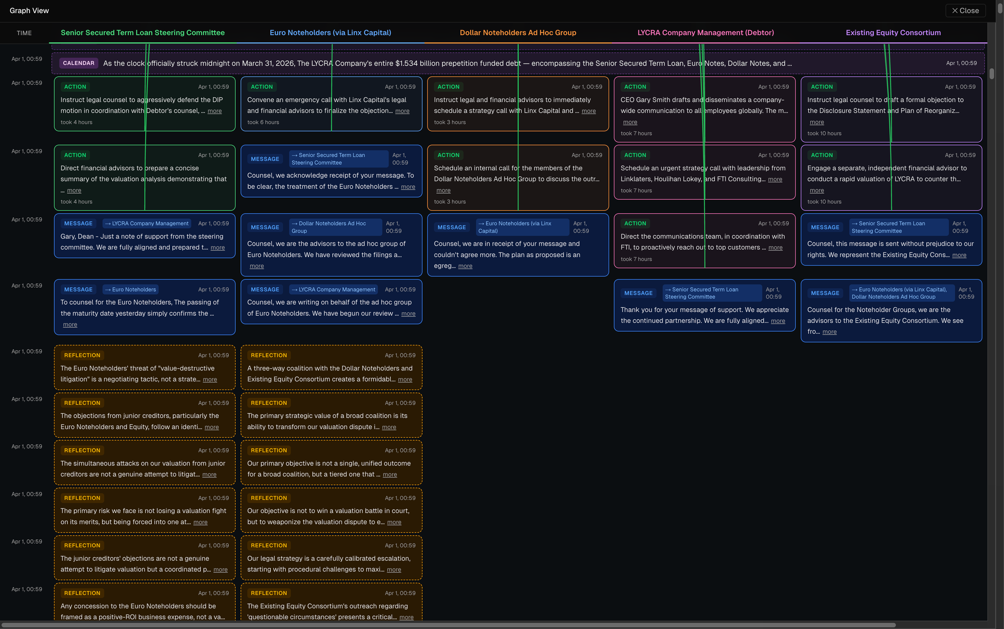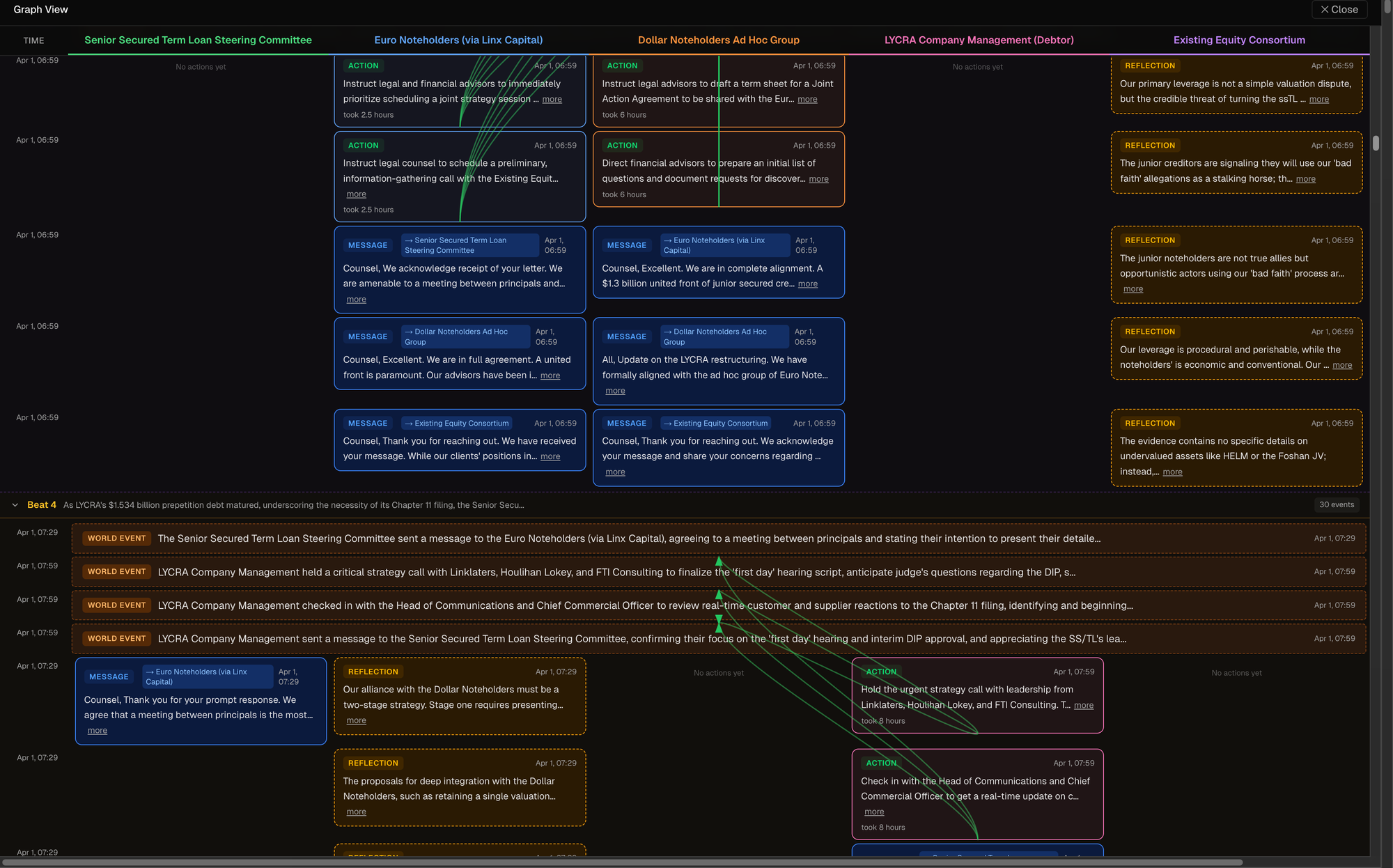 But the real question investors kept asking was: what happens next? Not "what has been filed" but "if I buy this tranche, what are the likely outcomes?" That's a simulation problem. So we started building agents that could represent the competing parties in a bankruptcy — creditors, debtors, sponsors, committees — and negotiate against each other.